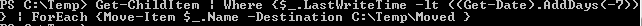 Uma vez que você tenha essa informação em mãos, o seguinte código deverá ser executado para que todos os arquivos com data de modificação 05/03/2015 ou inferior sejam movimentados para o diretório escolhido: Get-ChildItem | Where {$_.LastWriteTime -lt ((Get-Date).AddDays(-7))} | ForEach {Move-Item $_.Name -Destination C:\Temp\Moved }