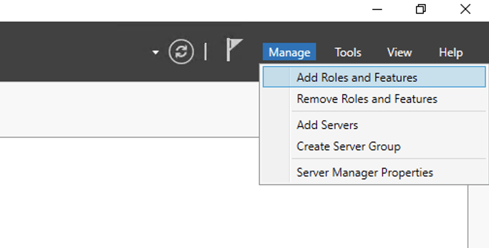 1. Open the Server Manager and click in Manage then Add Roles and Features: