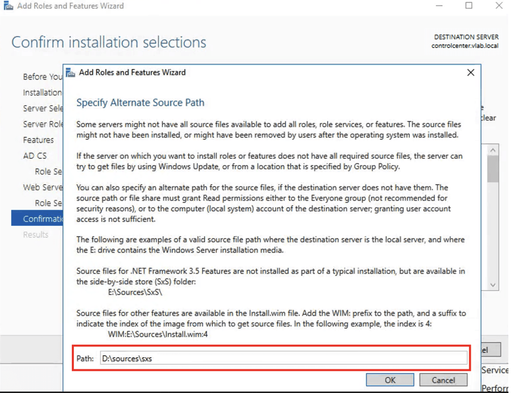 9. In most cases it is necessary to specify the path where the installers of the selected features are, since during the installation of Windows, these images are left aside to save space on the installation disk. So, make sure the operating system disk is available and set the Alternate Source Path to the correct path.