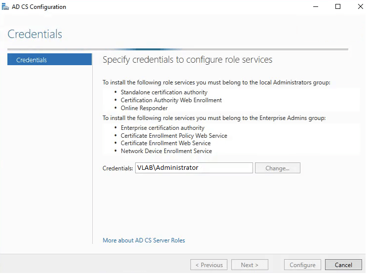 12. On the first configuration screen, select the credentials that will be used to configure AD CS services, then click Next.