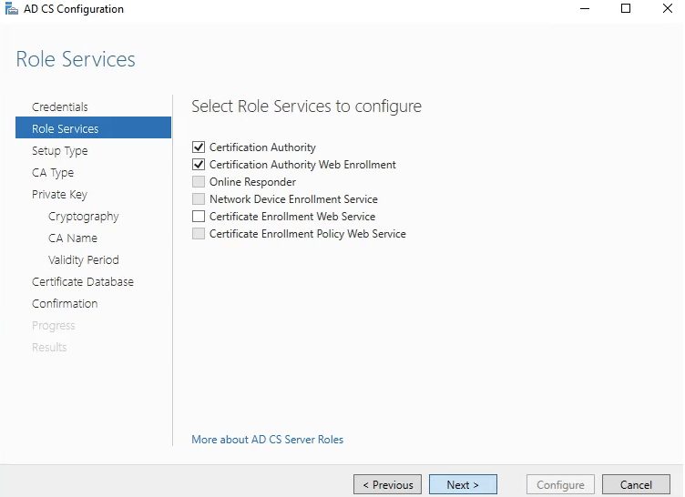 6. In AD CS, Role Services select Certification Authority and Certification Authority Web Enrollment.