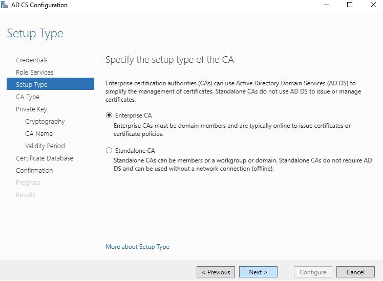 14. In Specify the setup type of the CA select Enterprise CA.