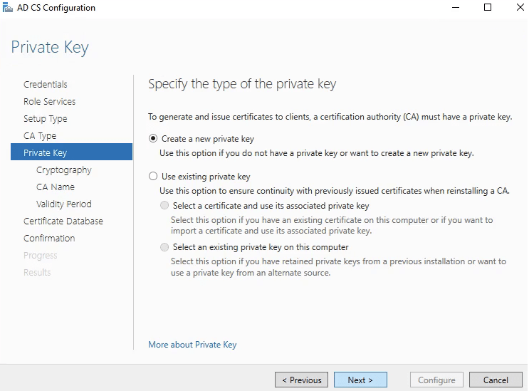 15. In Specify the type of the private key select Create a new private key.