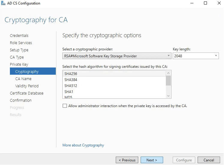 16. In Cryptography for CA select Specify the cryptographic options. RSA with key length 2048 and an algorithm SHA256 is the most recommended and common one today.