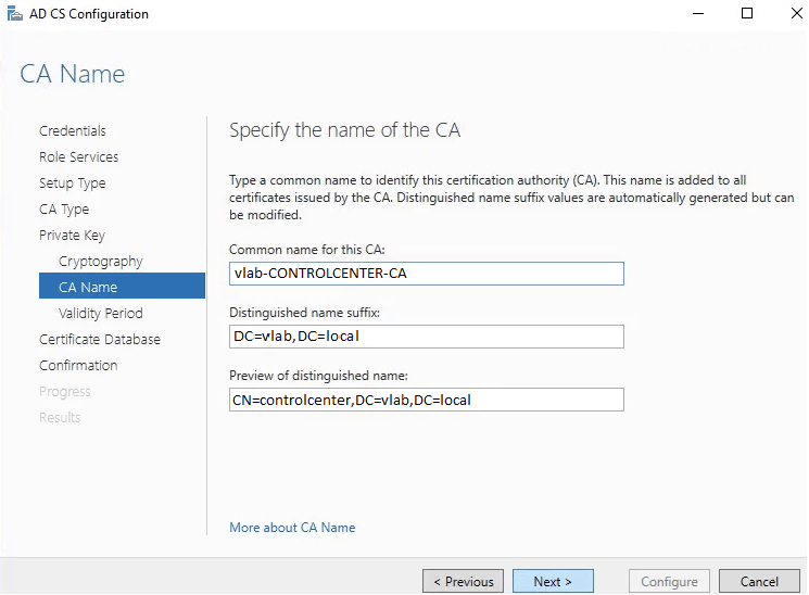 17. In Specify the name of the CA click Next.