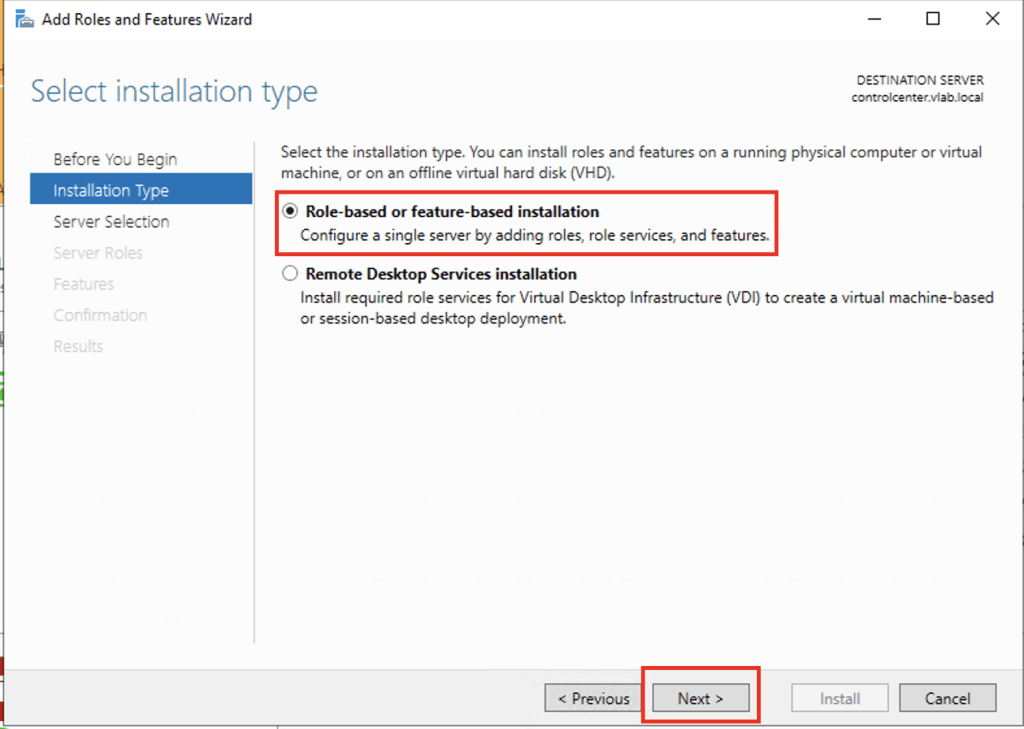 2. On the Before you begin screen, click Next. On the Select installation type screen, select Role-based or feature-based installation and then click Next.