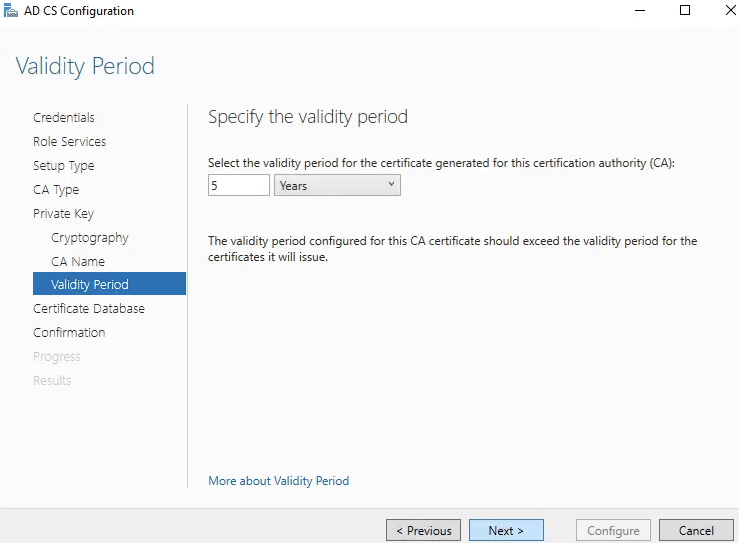 18. Em Validity Period selecione a validade do certificado da CA (root certificate). É importante ressaltar que nenhum certificado gerado pela CA pode ter uma data de expiração maio que a data de expiração do certificado da CA.