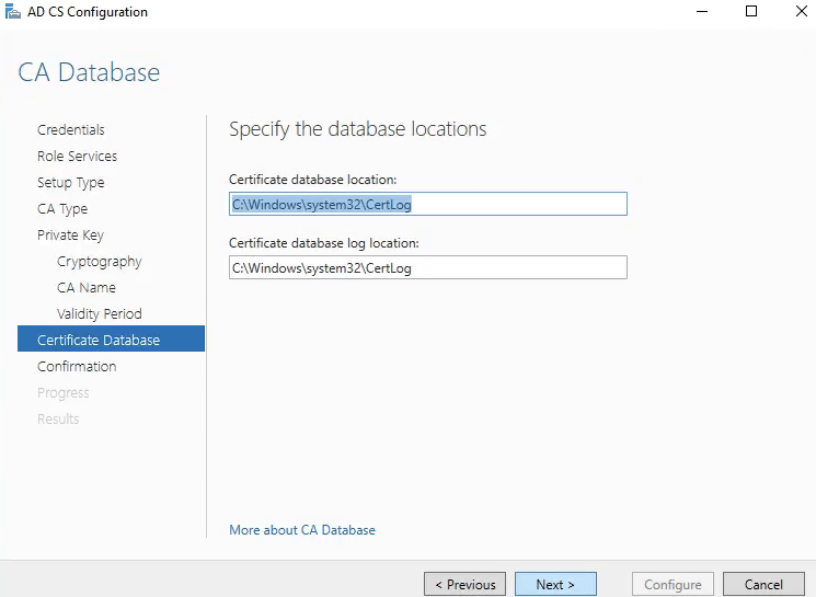19. Em CA Database informe os caminhos onde deverão ser armazenados os dados da CA.