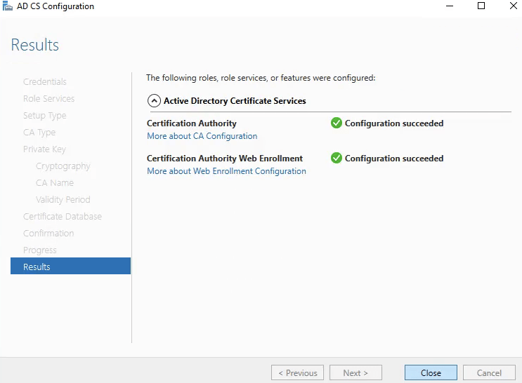 21. Uma vez que as configurações forem concluídas, a CA já está pronta para ser usada. Clique em Close.