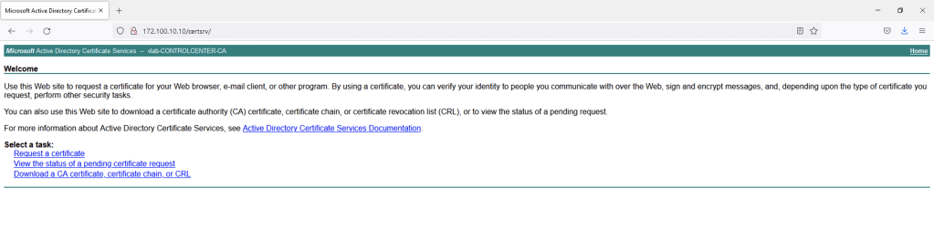 24. You can also access the certificate request URL to validate that everything has been properly configured via the URL: http://<CA-IP>/certsrv/.