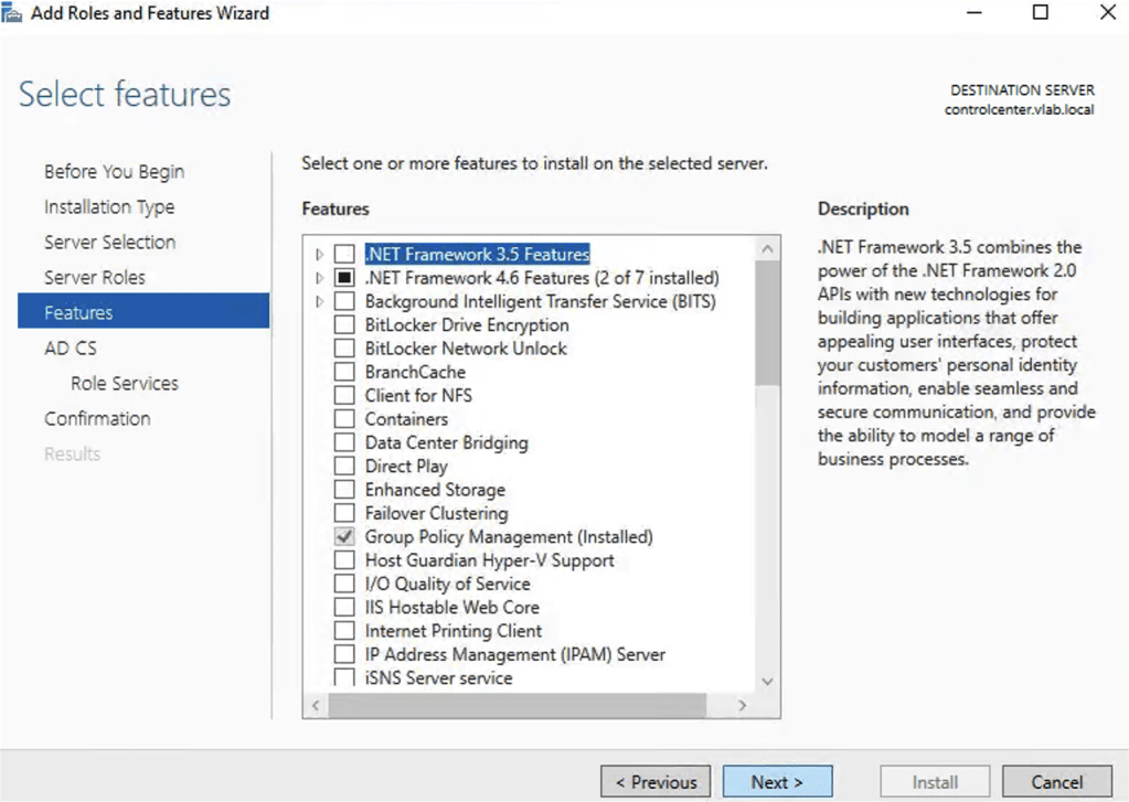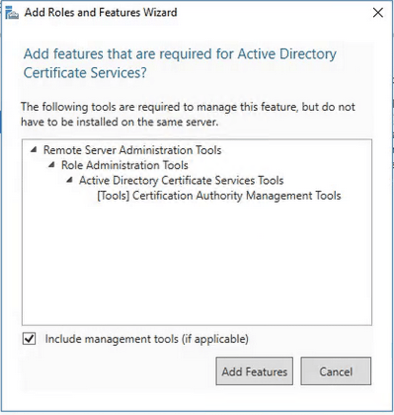 In the popup that will be displayed, select the option Include management tools (if applicable) and click Add Features.