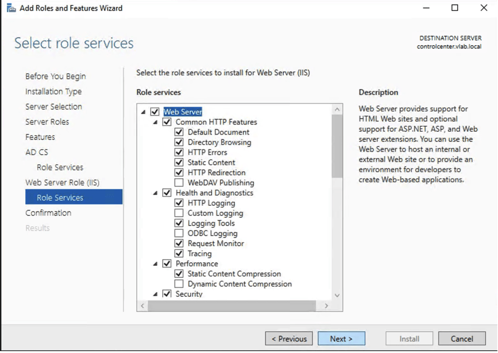 8. Em Web Server Role (IIS) selecione os serviços conforme demonstrado na imagem.